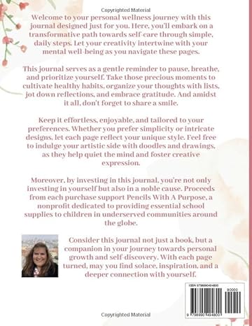 A journal to help you take a little time for yourself, because you matter. Do as little or as much as you like to work towards you. Everyday do something to take care of you. This journal incorporates mental, physical, emotional, and spiritual wellbeing